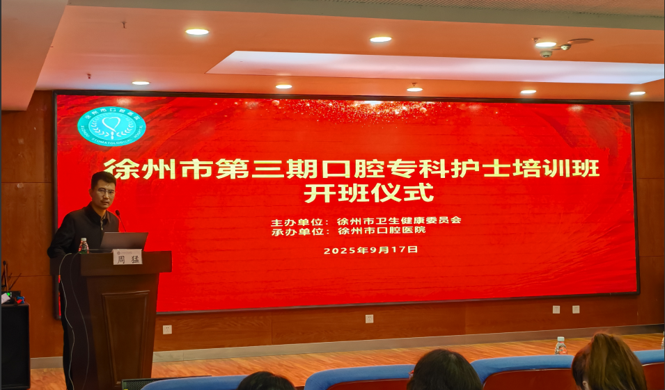 金秋送爽,丹桂飘香。2025年9月17日,由徐州市卫生健康委员会指导、徐州市口腔医院承办的“徐州市第三期口腔护理专科护士培训班”开班仪式顺利举行。全市各医疗机构护理骨干20余人齐聚一堂,共同开启为期两个月的口腔护理专科强化培训。徐州市护理学会夏静理事长、徐州市口腔医院党委书记陈昌锋,党委委员、副院长周猛等专家出席活动。开班仪式由徐州市口腔医院护理部主任王香玲主持。