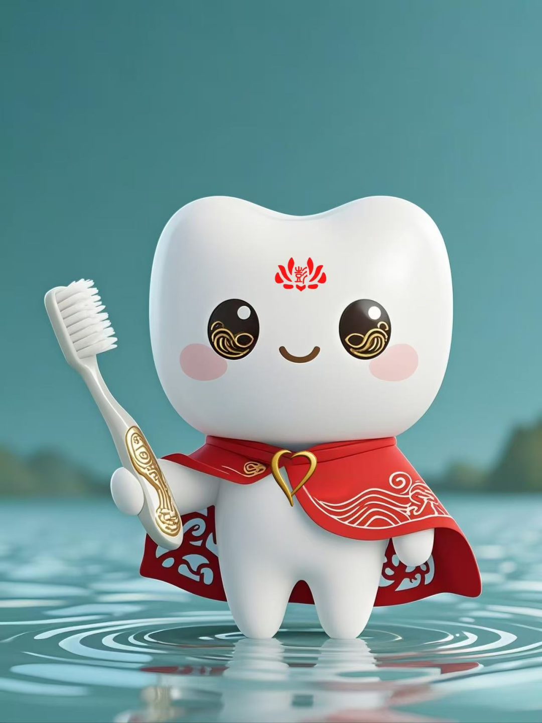 手中紧握的放大版牙刷是其重要标识。刷毛采用“云龙湖蓝”波浪形态,巧妙融合牙刷的清洁功能与水的流动性、洁净感,直接而生动地传递“科学刷牙、有效清洁”这一口腔健康的基石理念。这不仅是工具,更是口腔健康日常维护的科普图腾。